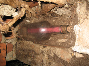 More investigation revealed that two stories existed about where the capsule had been buried. One theory was that it was in the right wing, the other on the left. After almost leveling the right wing we realized that yes, we'd been digging in the wrong place! Not three layers of brick into the left wing we heard a *clink* and we stopped dead in our tracks. Could this be it? After gently removing the last covering stone, we saw a faint glimmer