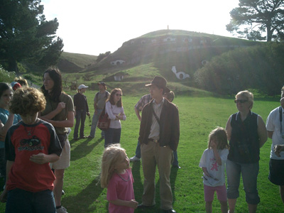 This is a nice picture of the Hill, the community of hobbit holes on a...well, on a hill. Oh yes, and I'm in full gear, too. I have many more pictures of the Hill, and of #3 Bagshot Row, Sam's house, which has the biggest chimney in hobbiton. The funny story is that Sam's hobbit hole originally had an extremely tall chimney, but the construction workers tore that part down on it. So, the owners came and decided to rebuild it, but instead of putting a huge chimney, they put a regular one. The reason was because of the pesky sheep on the farm. The sheep would rub up against it, and a ginormous chimney would probably fall down. Sam's house is the hobbit hole on the left side of the hill.