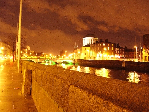 It was like flicking a switch, he turned on me instantly, yelling at me, hurling death threats, etc. I was quite concerned. So, I carried on my walk, when a couple of blocks later I saw he was following me, about a block back. So at the next left, I ran like the wind, then hung another left and ducked into a supermarket of some kind. I grabbed a box of hair dye from the shelf, ran into the men's room, and went to work. In 10 minutes, I was a fair haired young man with glasses and no ht with a black coat and silver backpack, miles away from the Fedora-clad, black backpack, red-coated Canadian I was previously. I exited the store, and BAM, ran right into my Neo Nazi buddy! He was certainly bent out of shape about something, as he grabbed me and threw me out of the way and ran into the supermarket, looking around (I assume for that Canadian Backpacker). So I was safe thanks to too many spy novels! I ran into the guy again that night around temple bar, but again he didn't recognize me. A certified nut, and not the kind of chap that you want on a welcoming committee! However, after that it was smooth sailing. Pictured above: The Four Courts at night, right across from my Hostel (which I shared with a group of Czechoslovakian nudists--it was rather awkward at times!)