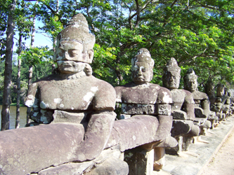 Approaching the south gate of Angkor Thom there are statues depicting a mythological tug of war between gods and demons. The “rope” of the tug of war is a snake called a “naga.” This tug of war is a creation myth called “Churning of the Sea of Milk” and is a common theme in Khmer art everywhere you go.