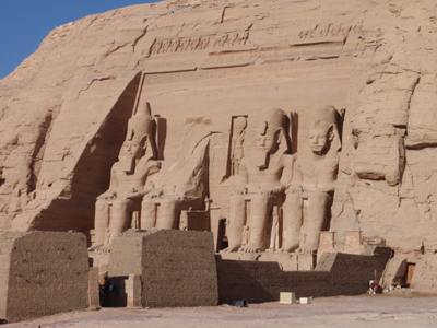 The Great Temple at Abu Simbel is one of the world's most fascinating engineering marvels. Taking about 20 years to build, it was finished in about 1265 BC. It was dedicated to the gods Amon-Ra, Ptah, Harmakhis and Ramses II himself, who demanded to be worshipped as a god. The front of the temple had four spectacular statues, 60 feet tall, of Ramses. They depict him at different times of his life, from left to right, youngest to oldest.