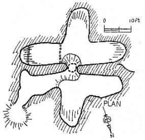 After tying the rope we had found near the entrance to the wood to a tree branch we slowly slid down the slope; with electric torches at the ready. After sliding about 5 ft into the slip down slope we shone the torches down and decided it looked almost impossible to proceed. By grabbing hold of the rope and slipping on our backs a little further we found what looked like an even smaller gap in fact turned around a corner and opened up into the 8ft high main chambers. Shinning the torches into to the small gaps above our heads we noticed that the roof was moving ever so slightly. Shining our torches into this area we noticed… SPIDERS. Lots of them and BIG! This was truly turning into Raiders of the Lost Ark adventure (getting lost with a companion and a map and now SPIDERS)! Once we had slipped down the final decent we found ourselves in a 30ft long cave like structure 8ft high and almost cathedral like in scale! There were 6 chambers in total (included the collapsed one we had used to enter the denehole. The only light was that from the shaft above us and yet even when the torches were turned off it was pitch black The layout of the tomb was as shown on this ground plan made by the archeologists, note the collapsed chamber in the bottom left, where we entered from: |