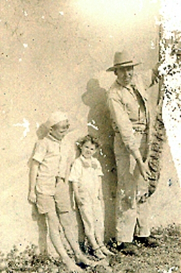 My aunt Barbara told me the story almost 24 years ago as she stood by her shelf filled with all the different frog figurines she had received as gifts over the years. It wasn’t until just recently that I found the photographic evidence of that afternoon’s activities back in 1938. Going through pictures my Dad had transferred to his computer from old photos and slides, I found the shot him at 6 yrs old, a 4 yr old Barb, and my grandfather holding up a snake with a head the size of a large bullfrog. Although the right hand edge of the photo is distorted by age there is enough of the snake visible to realize it was at least as big around as my grandfather’s thigh, a man who at the time stood 6 foot 1" and weighed over 230 lbs, all bone and muscle. Asking my Dad about the picture, he confirmed "Oh yeah, that’s Barbara’s snake. By the way, did she ever tell you about why she hates frogs so much?"