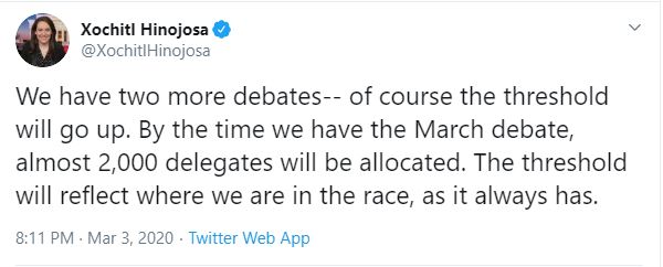 Xochitl Hinojosa via Twitter - We have two more debates-- of course the threshold will go up. By the time we have the March debate, almost 2,000 delegates will be allocated. The threshold will reflect where we are in the race, as it always has.