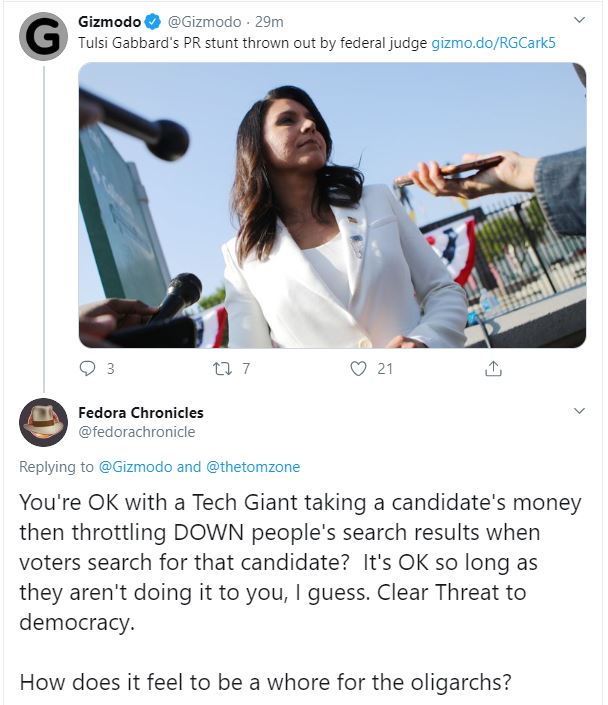 Gizmodo: "Tulsi Gabbard's PR Stunt Thrown Out By Federal Judge," by Tom McKay | March 4th, 2020