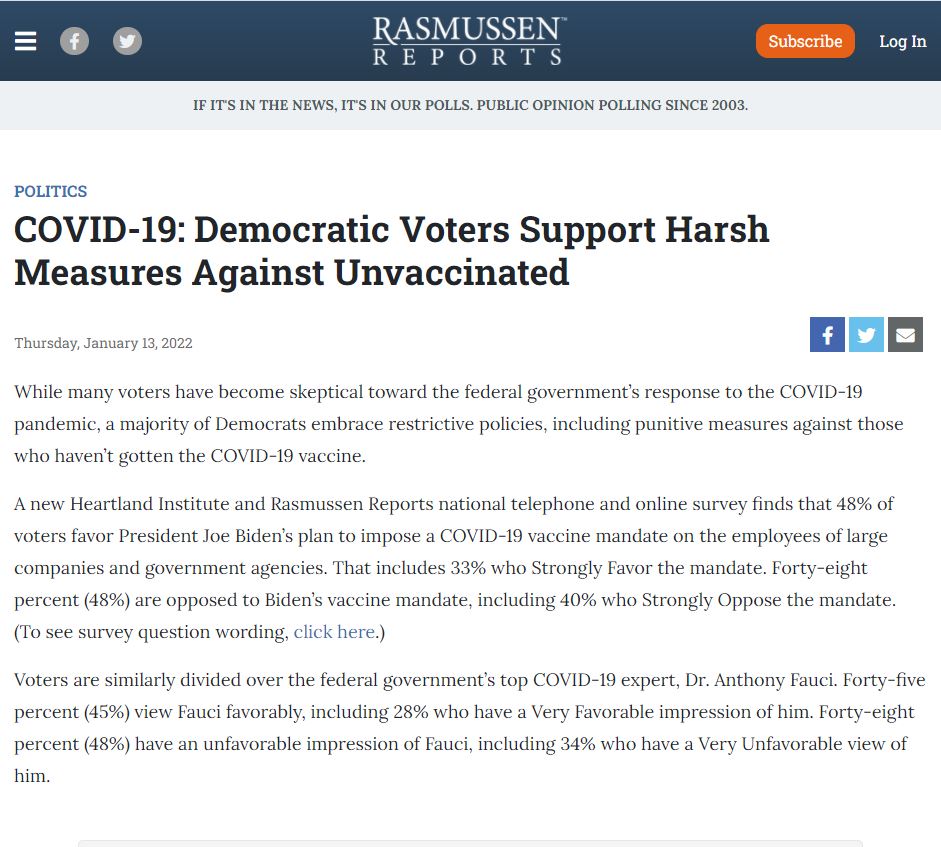 Rasmussen Reports: "COVID-19: Democratic Voters Support Harsh Measures Against Unvaccinated," January 13th, 2022