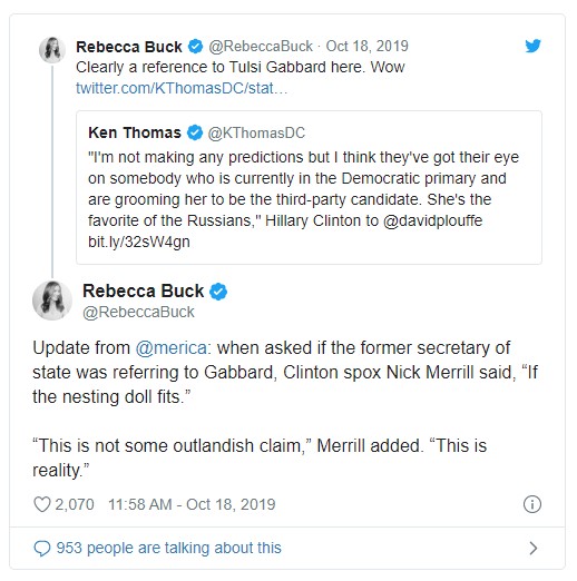 Washington Examiner: 'If the nesting doll fits': Clinton aide defiant on Tulsi Gabbard 'Russian asset' claim by Tim Pearce | October 18, 2019