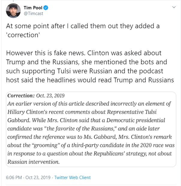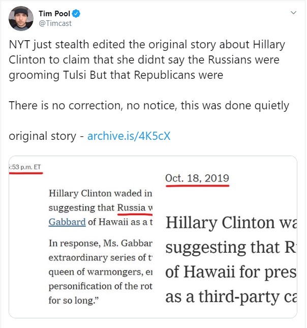 NYT QUIETLY EDITS ARTICLE: NOW CLAIMS HILLARY ACCUSED “REPUBLICANS,” NOT “RUSSIANS,” OF GROOMING TULSI GABBARD NYT only issued correction after being called out by independent journalist Adan Salazar | Infowars.com - OCTOBER 24, 2019