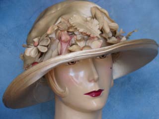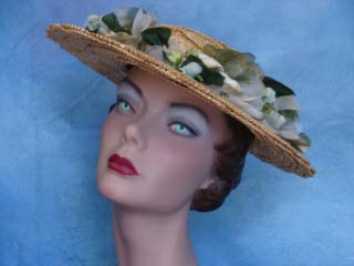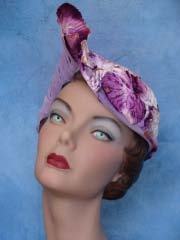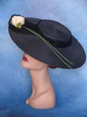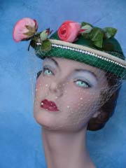 The 1920’s brought about the cloche, so dramatically ensconcing the flappers head that she could hardly see, all done in the name of liberation as women gained the right to vote and liberate their heads from coils of heavy hair cut off in the shingled or bobbed style. The 1930’s hat fashions seemed to emphasize the austere days of depression soon to be followed by the worried and weary war days of the 1940’s. Women wore “toppers” so precariously perched on their heads as to leave the mind boggled at how they stayed on. To me the toppers mirrored the insanity of the whole world for a second time at war. Hats weren’t the only thing that seemed at any moment ready to topple! |
