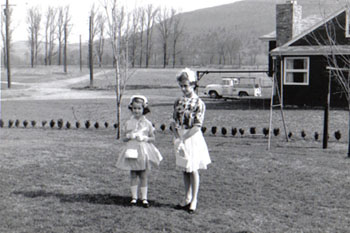 on the left is Lorraine and her sister, both in their Easter Bonnets...The final touch for any Easter outfit would be an Easter Bonnet! In my family that meant a trip to the Betty Sutton Shop** in Bath, NY was in order. Once there, little girls could find a very special straw boater perched high upon glass shelving. Its brim would be encircled with bright gross-grain ribbon. Once placed upon my head to check fit, two long streamers of ribbon would hang down my back giving me the feeling of a royal train and me a grand lady. Artificial spring flowers would surround the crown of my hat and these flowers and ribbon would coordinate with my new dress. The next year pansies or violets might show up on my new hat and some years even a whole tossed salad of flowers and greens. Once purchased, I would carry the bonnie thing home in its coordinating hatbox that denoted in pretty script the manufacturer of the hat and the store name.