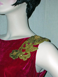 gold metallic passementerie on the left front shoulder. Violet’s mid calf