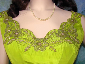 Shirley’s scalloped neckline is adorned with silver beads and faux pearls